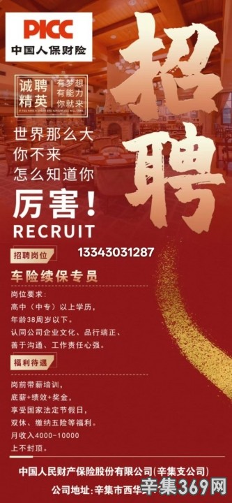 中国人民财产保险股份有限公司(辛集支公司)招聘: